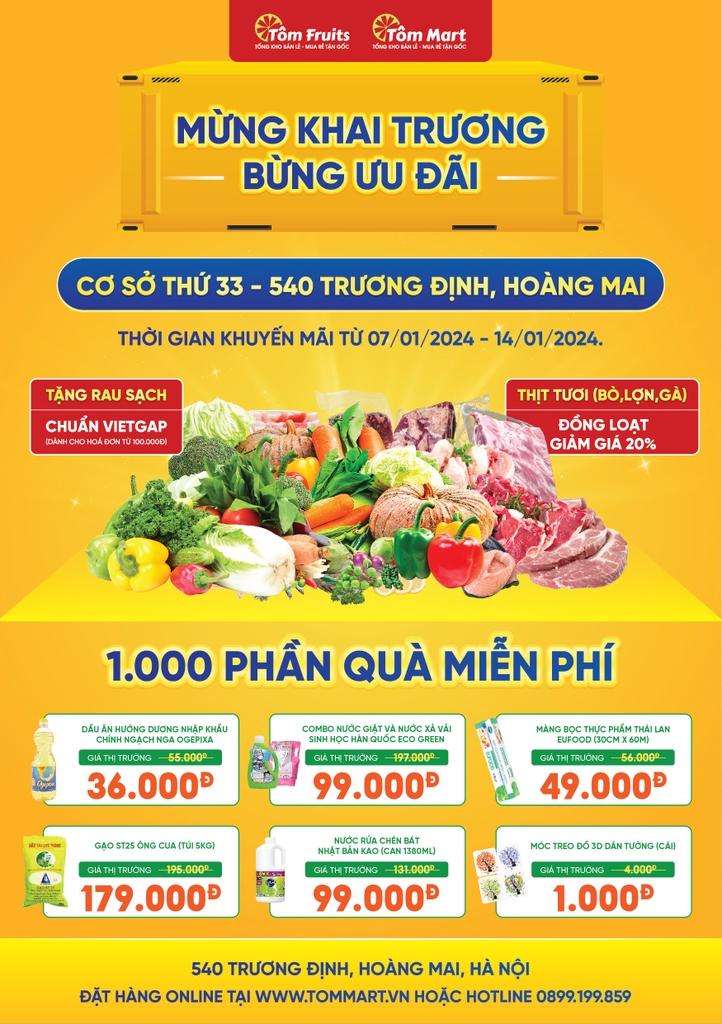 Tôm Mart - Hệ thống tổng kho bán lẻ hàng thiết yếu (Một thành viên của Tôm Fruits) tưng bừng chào mừng thành viên mới thứ 33. Cơ sở được khai trương vào ngày 07/01/2024 tại địa chỉ số 540 Trương Định, Phường Tân Mai, Quận Hoàng Mai, Thành phố Hà Nội.